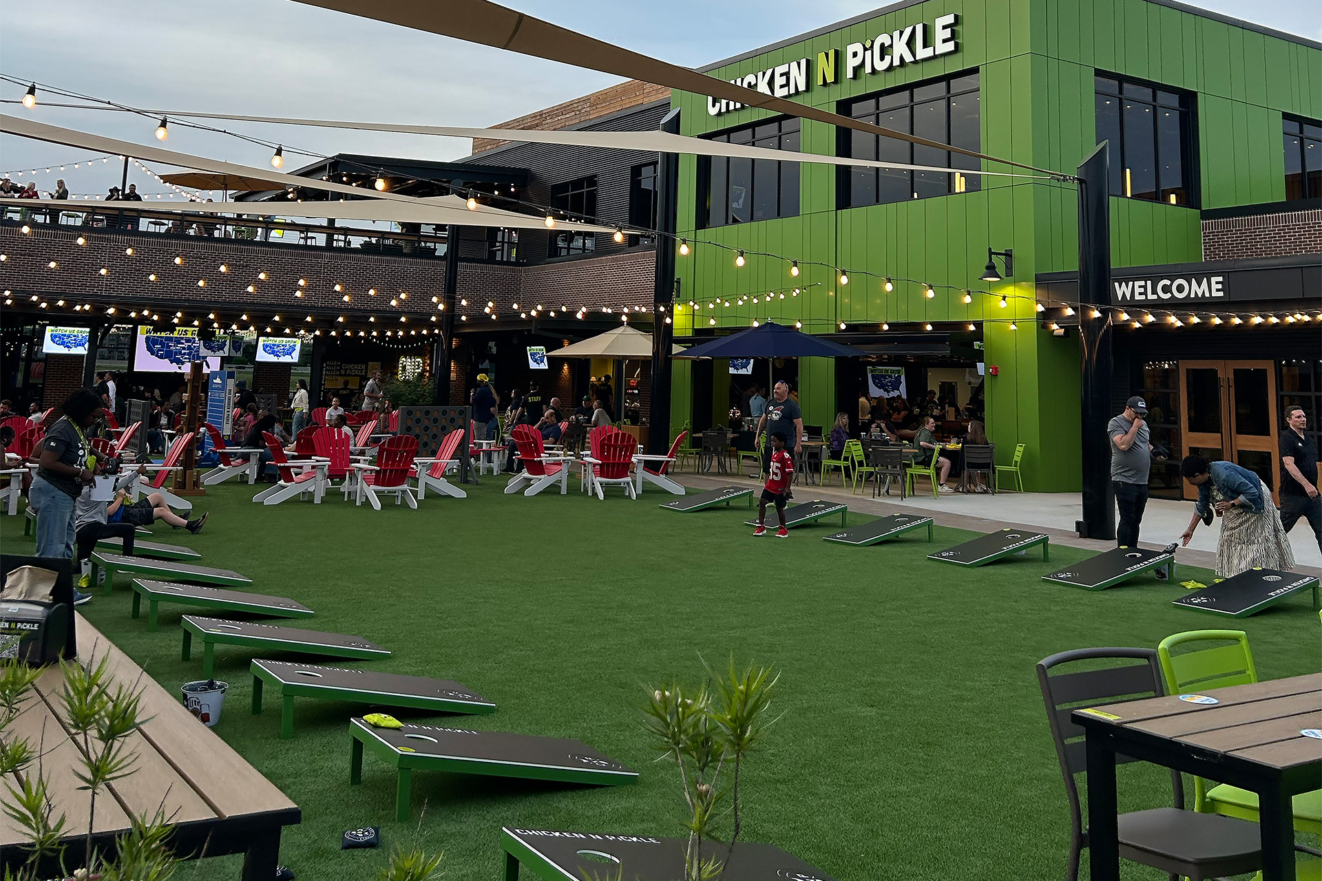 Chicken N Pickle, the family-friendly indoor/outdoor “eatertainment” venue featuring a restaurant, pickleball courts, a sports bar and a variety of yard games, has opened at The Farm in Allen. The Farm is a 135-acre mixed-use project, and the new 42,000-s.f. location boasts multiple bars and dining areas throughout the main floor, rooftop seating and ample spaces across the outdoor game yard. In addition to indoor and outdoor pickleball courts, visitors can play yard games including cornhole, ping pong, Battleship and giant Jenga.